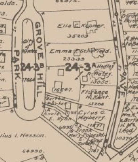 The house’s permit history shows a 1922 permit for a garage 13’6″ from the lot line. It is shown in the 1929 Newton City Atlas.