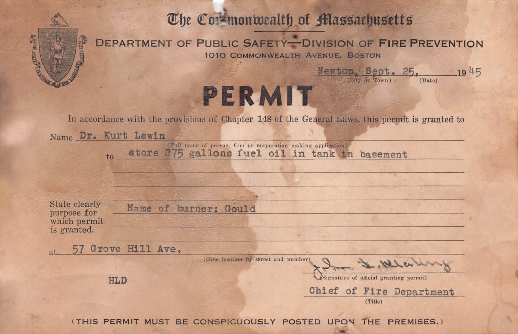 We discovered that Kurt Lewin lived in the house when Lisa found this permit on a basement column 2 years after we moved in. It has been obstructed by furniture before then.